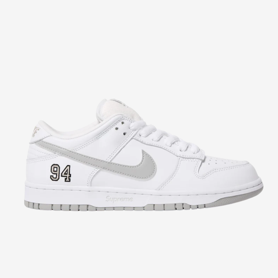 O Nike SB Dunk Low Supreme 94 "White Metallic Silver" é a união perfeita entre herança do skate e estética refinada. Lançado como parte da collab entre Nike SB e Supreme, o modelo aposta em um visual clean com impacto visual forte, graças ao contraste entre o branco puro e os detalhes prata metálico.
