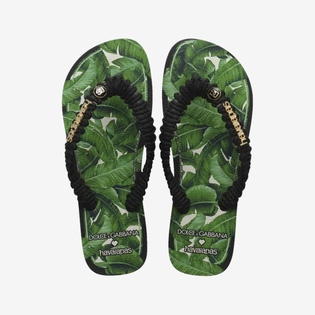 Parte do segundo lançamento da nossa colaboração com a icônica marca de moda italiana, os novos chinelos Banano Dolce&Gabbana x Havaianas possuem tiras de macramê feitas a mão.